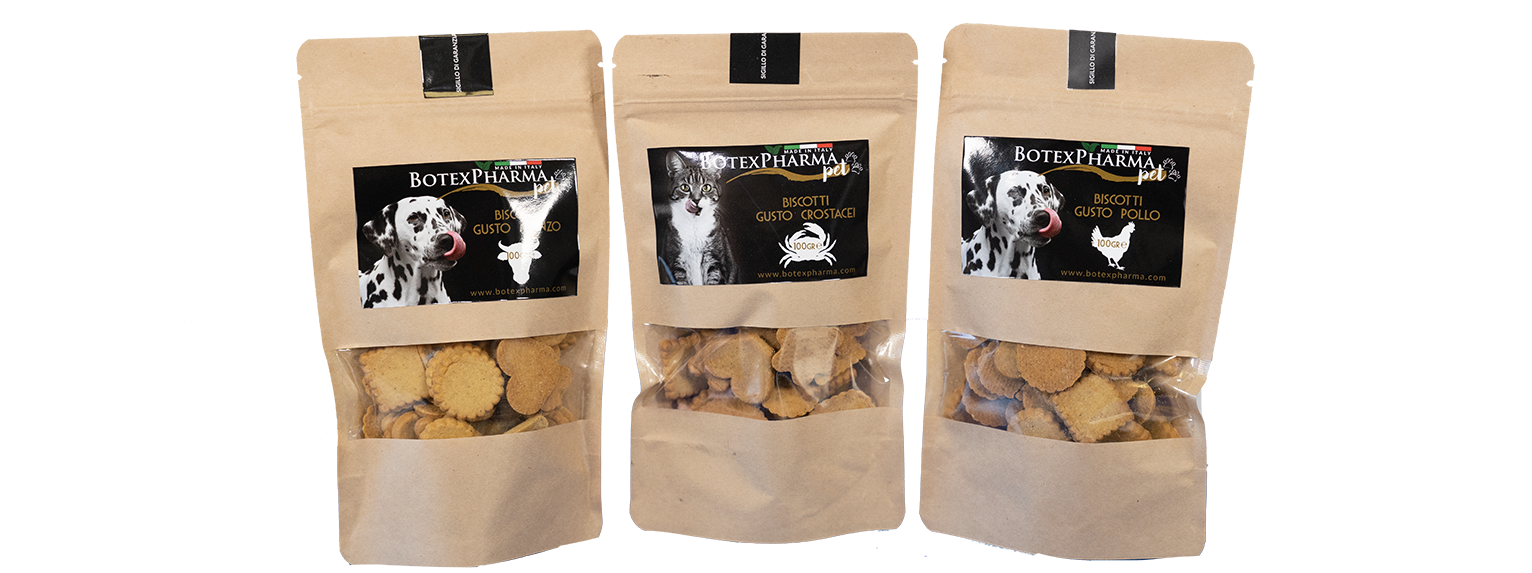 Quando il nostro amico a 4 zampe ci guarda con i suoi speranzosi occhioni, scodinzolando o facendo le fusa, dobbiamo avere sempre a portata di mano un biscotto o un piccolo snack. Risulta poi evidente che dobbiamo offrire ai nostri amici qualche cosa di sano e naturale. BotexPharma ha inserito nella propria Linea Veterinaria, prelibati biscottini che possono essere facilmente integrati in una sana e corretta alimentazione. Questi biscotti per cani e gatti, sono naturali al 100% e soddisfano tutte le esigenze dei nostri preziosi e fedeli amici. Non dimenticate che biscotti e snack, non rappresentano un sostituto del cibo e devono essere offerti in dosi moderate, come piccoli premi e gesti d’amore.
